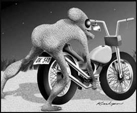 SLEAZY RIDER: alien from space checks out Stan Goodbrow's motorcycle in NEWS artistDick Kulpa's illustration.