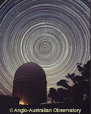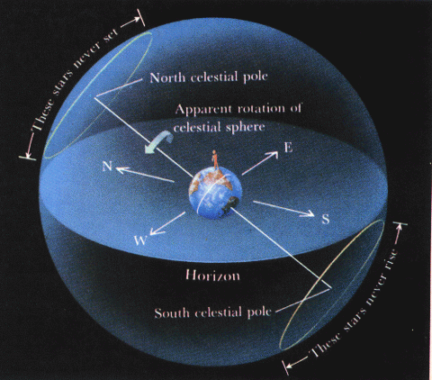 | Stars | E to W in about 12 hours (modulated by season, by latitude, and by where the star is on the sky: circumpolar stars, for instance, do not rise and set, but they will travel in a circle around the pole, 180 degrees in 12 hours minus about 4 minutes.) Star rise is about 4 minutes (3m 56s) earlier each day. | The stars remain fixed on the celestial sphere with respect to themselves. The earth's pole describes a circular wobble of 23.5 degree amplitude centered on a point in the constellation of Draco every 26,000 years (often called "precession of the equinoxes"). |