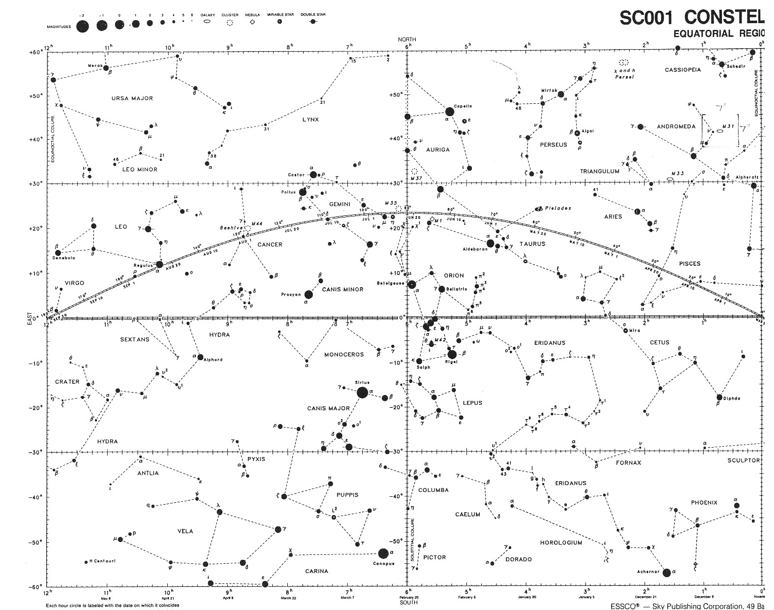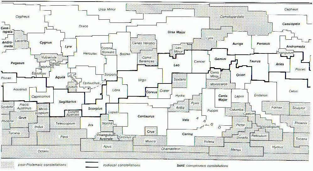 All 88 Constellation boundaries. | Constellation map, winter sky | Constellation map, summer sky | Constellation map, north polar region