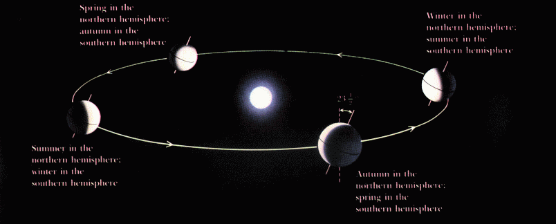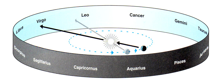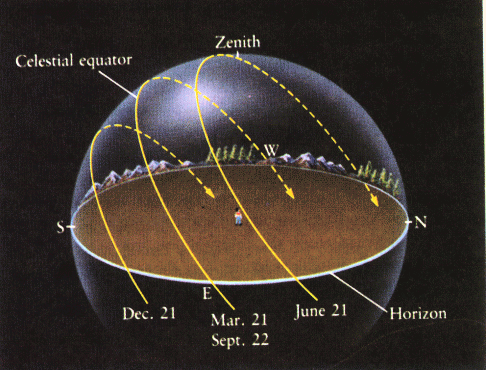 | Sun | E to W in about 12 hours from sunrise to sunset. Length of day varies from season to season and with latitude. | W to E along the ecliptic 1 degree per day. The height of the sun in the sky at noon is at maximum in the summer, minimum in winter (excludes tropical regions). The sun returns to the same constellation in 1-year intervals. |