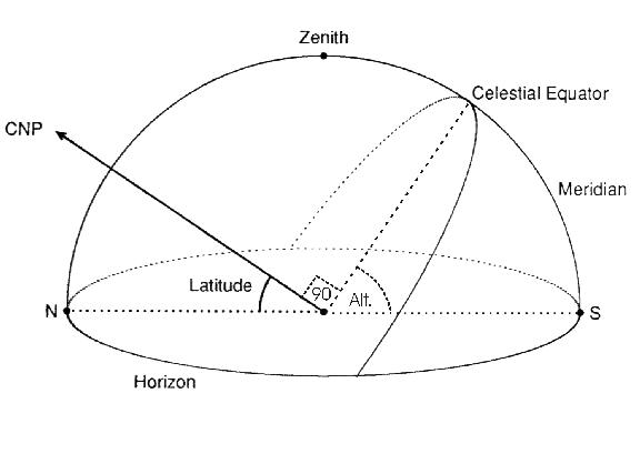This works south of the equator also, but you have to switch all of the "norths" with the "souths". The final point to make about this is that these latitude/declination/altitude correspondences are always true, but that longitude/right ascension correspondences depend on the hour of the day and also the season.