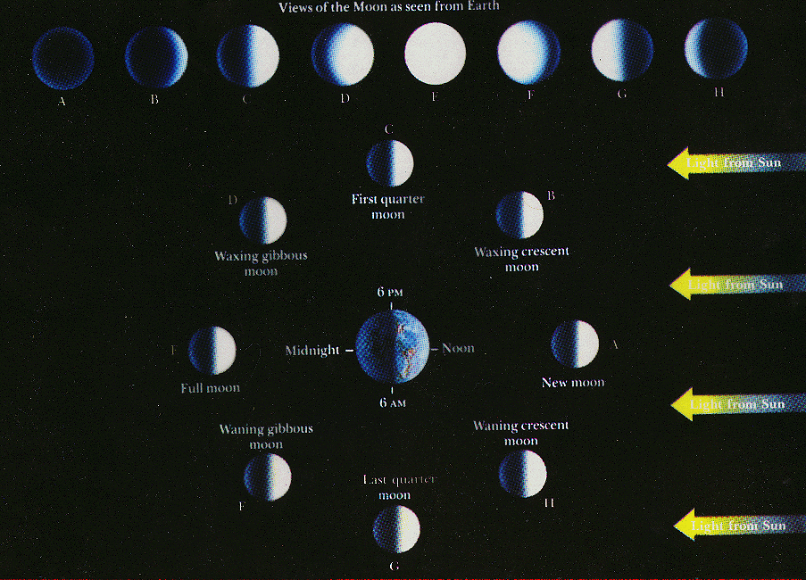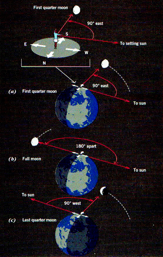 | Phase | Sun-earth-moon angle (degrees) | Approx. time that moon crosses your meridian | Less 6 hr = rise time | Plus 6 hr = set time |