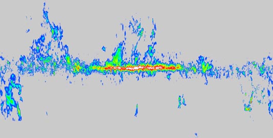 The Milky Way in the light of radioactive Al26 gamma rays. (Al26 decays to Mg26 with half life about a million years. Common Al is Al27, and is not radioactive.) COMPEL instrument aboard Compton Gamma Ray Observatory.