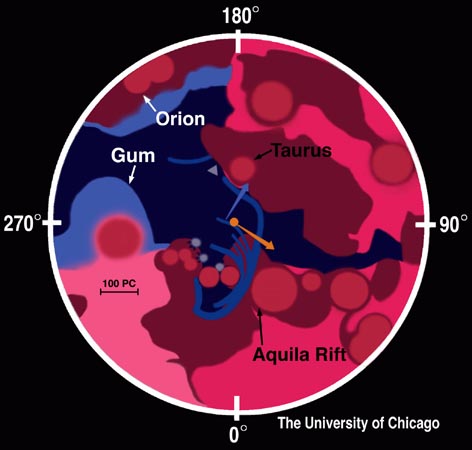An inferred map of the (optically invisible) insterstellar medium in a 500-parsec radius around the sun. Nearly spherical bubbles