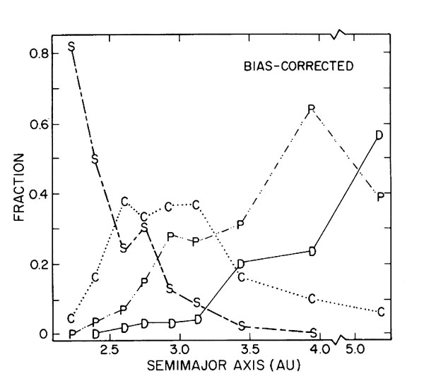 | M-type | Metallic iron-nickel surfaces. Albedos 0.10-0.18, reddish, inner belt comixed with S-types. |